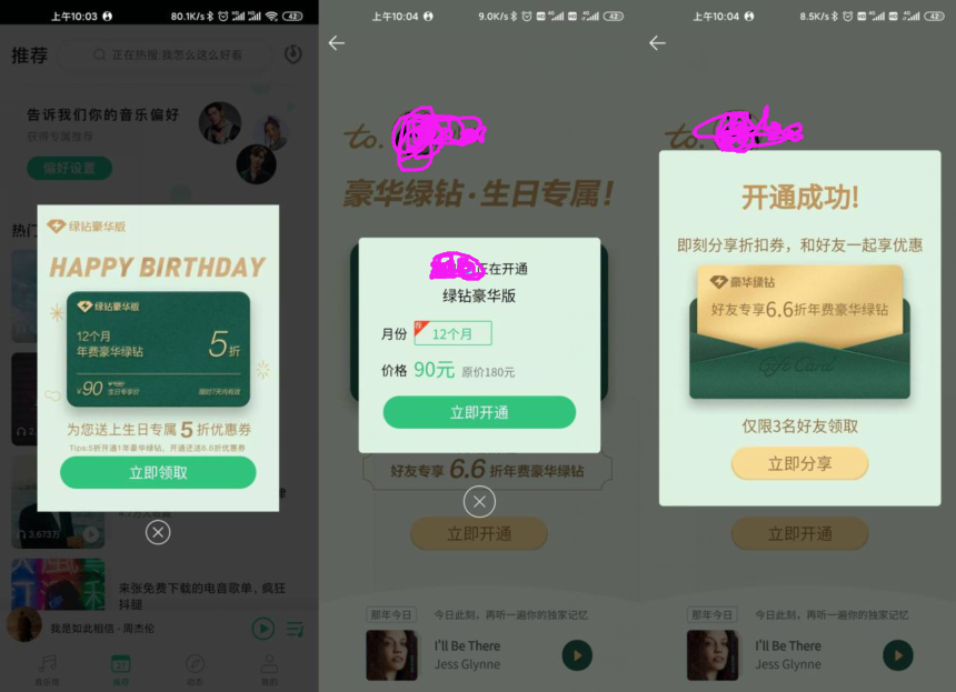90元一年豪华绿钻 原创 小才子 2020-04-27 21:33:56 阅读 1061 次 评论 0 条 摘要:此方法每号一年可开一次!刚需的就上!首先打开手机QQ我的资料->编辑资料->生日修改为今天的日期(今天4月27日就改为1999-4-27)然后打开QQ音乐app使用QQ登录等几秒会弹窗5折生日券->立即领取开通即可->只要90元一年PS:如果没弹窗,去我的->右上角邮件小图标进入消息中心->官方通知->生日快乐里查看开通 此方法每号一年可开一次!刚需的就上!首先打开手机QQ我的资料->编辑资料->生日修改为今天的日期(今天4月27日就改为1999-4-27)然后打开QQ音乐app使用QQ登录等几秒会弹窗5折生日券->立即领取开通即可->只要90元一年PS:如果没弹窗,去我的->右上角邮件小图标进入消息中心->官方通知->生日快乐里查看开通 本文地址:http://diyfox.com/article/348.html 版权声明:本文为原创文章,版权归 小才子 所有,欢迎分享本文,转载请保留出处! 点赞 分享: PREVIOUS:21天书法训练营 NEXT:20200427免费领取QQ阅读会员30天 文章导航