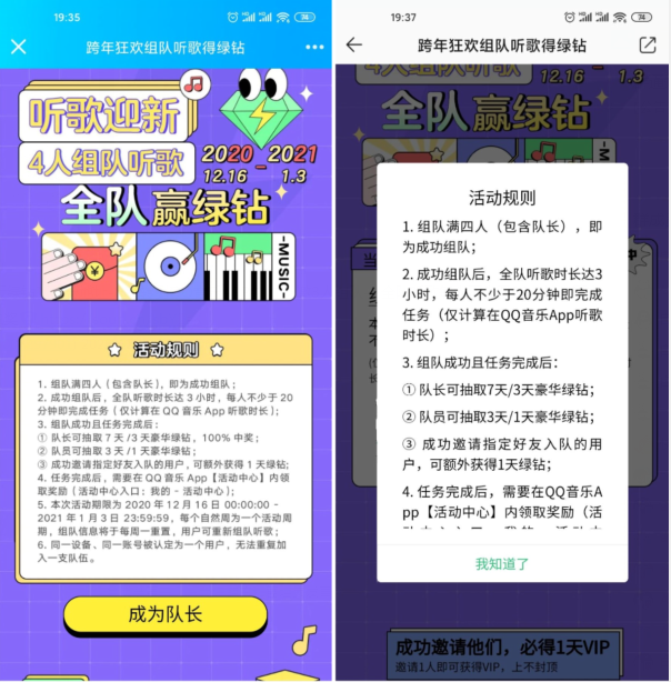 20201220_QQ音乐组队抽1~7天绿钻 原创 小才子 2020-12-20 07:58:56 阅读 799 次 评论 0 条 摘要:打开地址->跳转到QQ音乐APP参加->邀3人组队->全队听歌每人不少于20分钟就算完成->队长必中->队员抽奖地址: https://sourl.cn/sbY2aX 打开地址->跳转到QQ音乐APP参加->邀3人组队->全队听歌每人不少于20分钟就算完成->队长必中->队员抽奖地址: https://sourl.cn/sbY2aX 本文地址:http://diyfox.com/article/780.html 版权声明:本文为原创文章,版权归 小才子 所有,欢迎分享本文,转载请保留出处! 点赞 分享: PREVIOUS:20201219英雄联盟老用户领取2Q币 NEXT:20201221免费领取7天微博会员 文章导航